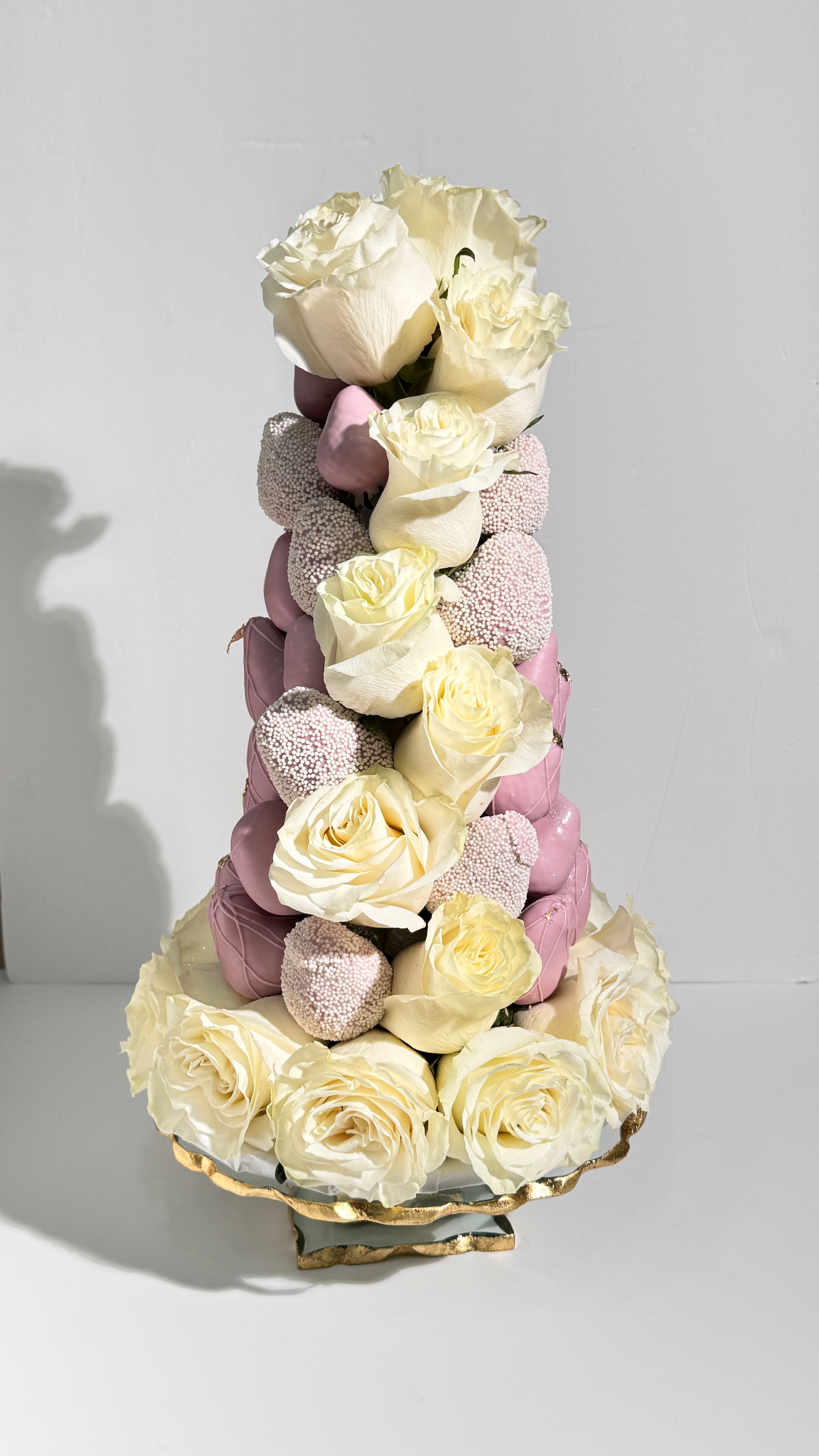 Looking for a unique chocolate covered strawberries arrangement? Checkout our beautiful tower. This unique arrangement boasts beautiful roses, decadent chocolate-covered strawberries adorned with pearl sprinkles and edible gold flakes. Perfect for those who crave thrilling and luxurious experiences!