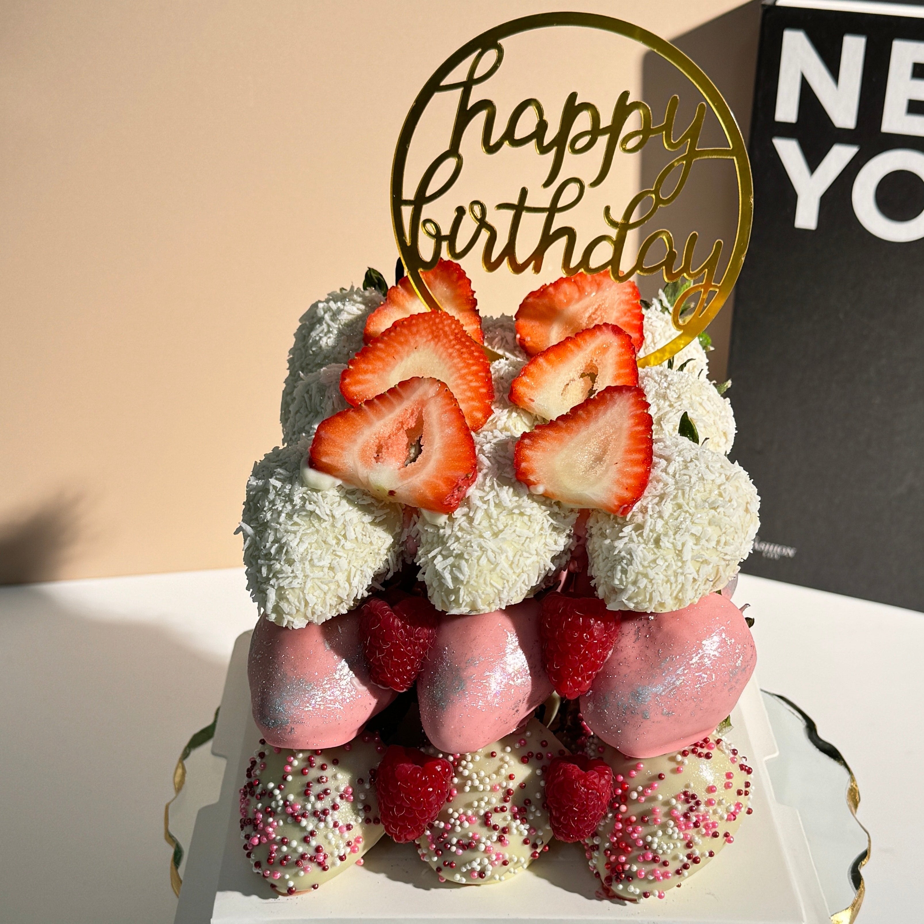 Experience the art of luxury gifting with our Signature Strawberry Cake, where each hand-dipped chocolate strawberry is crafted to perfection. Finished with coconut flakes, a pink satin shimmer, and delicate edible accents, this stunning creation is both a visual centerpiece and a taste sensation.