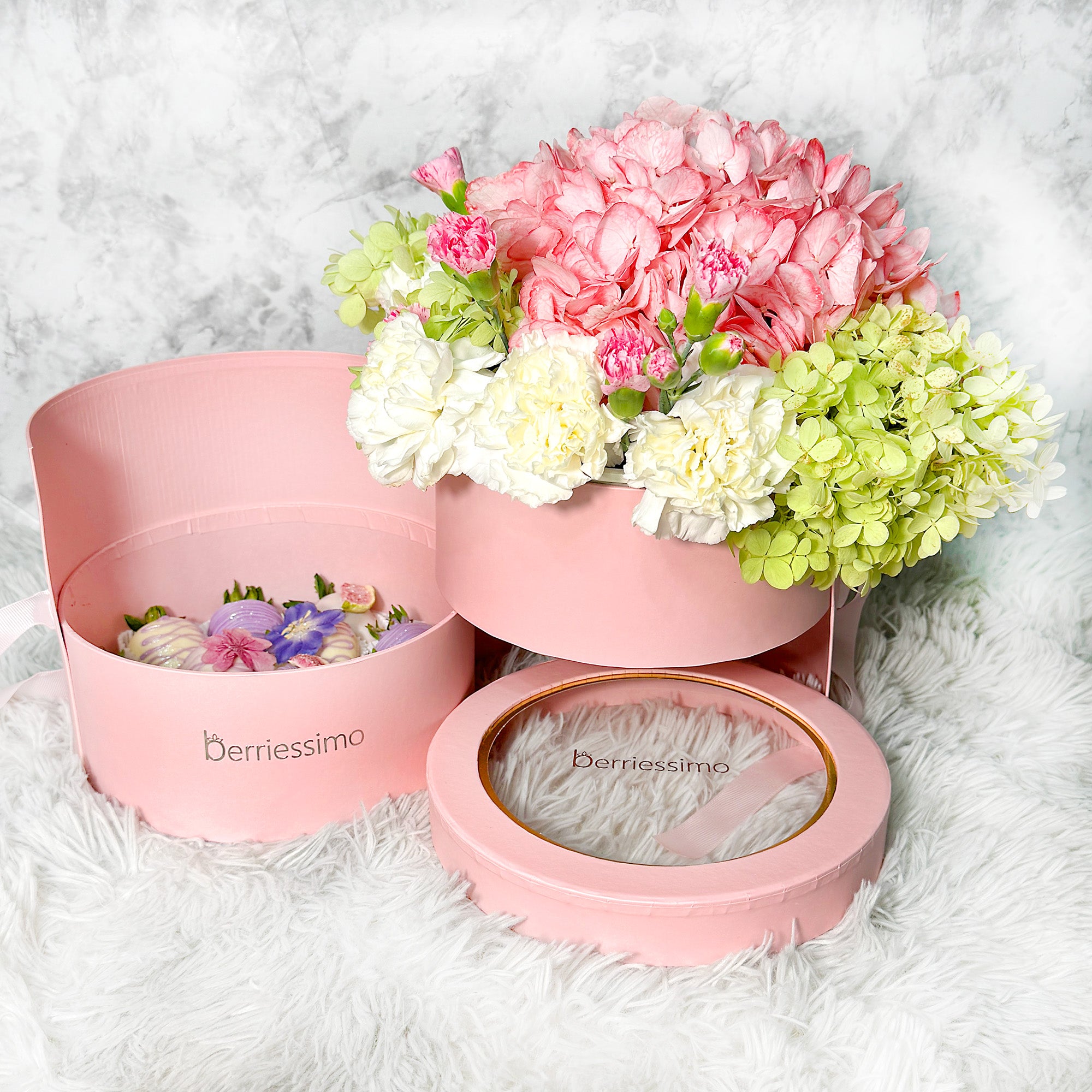 Looking for an extravagant gift? We offer you the most beautiful and delicious option! This beautiful surprise box arrangement features decadent, rich white chocolate covered strawberries and fresh, fragrant flowers. Satisfy your cravings and brighten your day with this irresistible combination of sweetness and beauty.