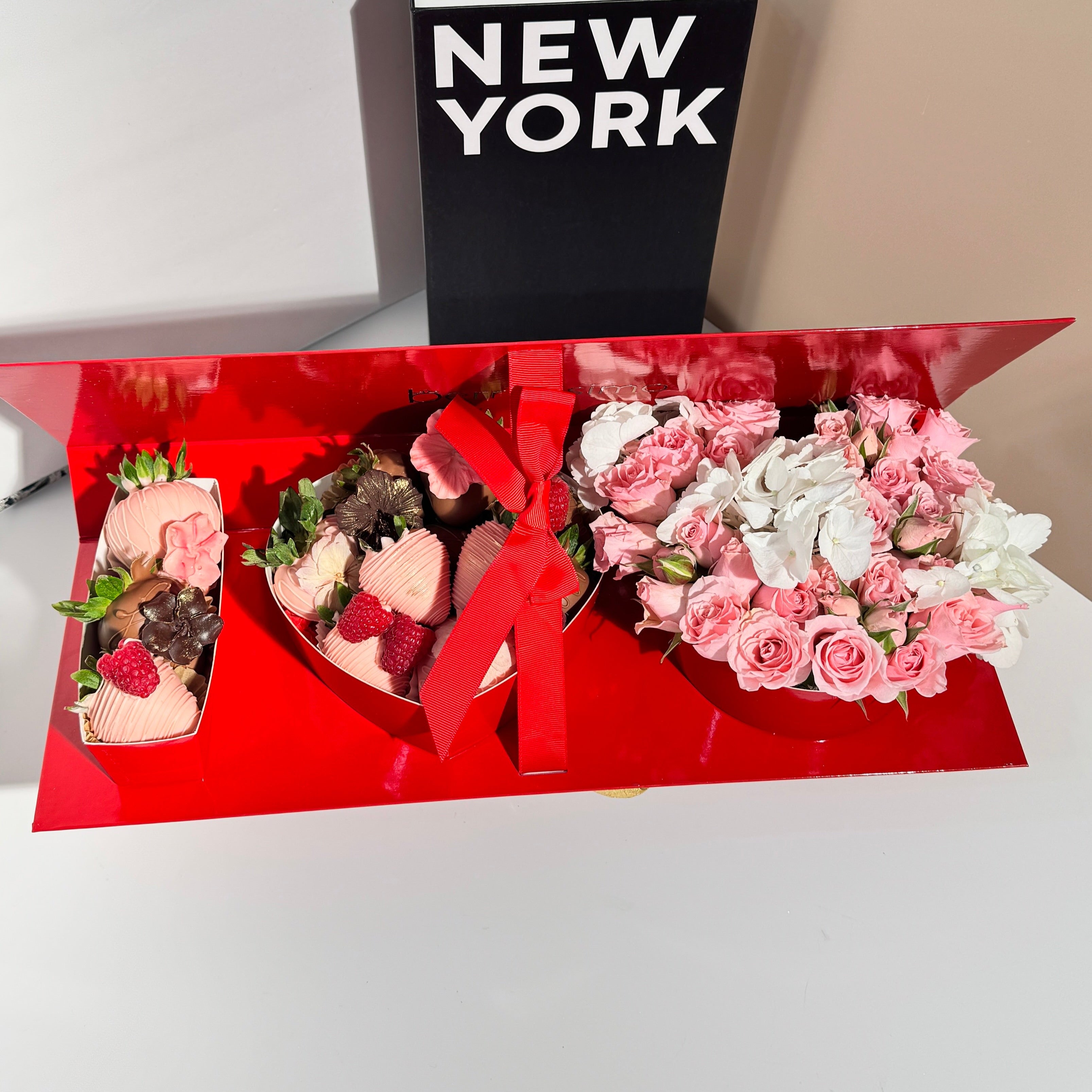 Looking for an extravagant gift? We offer you the most beautiful and delicious option! This beautiful Love box arrangement features decadent, rich chocolate covered strawberries and fresh, fragrant spray roses. The perfect gift for Valentine’s Day or any occasion filled with love. Thoughtfully crafted and brimming with elegance, this delightful treat is sure to make any moment unforgettable.