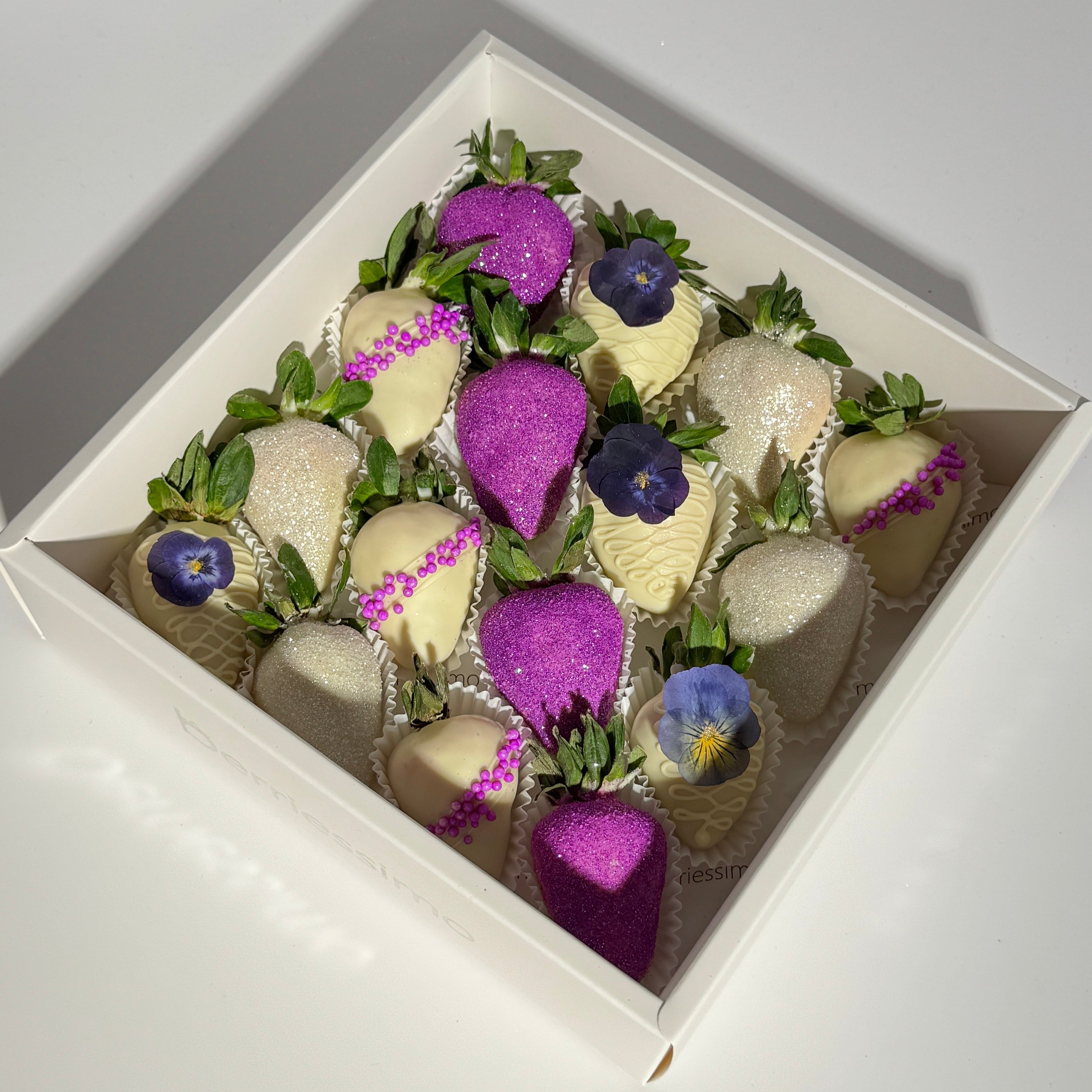 Discover the ultimate indulgence with our fresh, plump strawberries expertly dipped in velvety white chocolate. Each strawberry is beautifully decorated with vibrant deep purple edible glitter, delicate freeze-dried flowers, elegant pearl sprinkles, and a touch of silver luster dust for a stunning visual appeal. Perfect for any celebration, these luxurious strawberries deliver a delightful burst of flavors and a truly unforgettable treat. Elevate your special occasion with this gourmet, chocolate-covered strawberry experience.