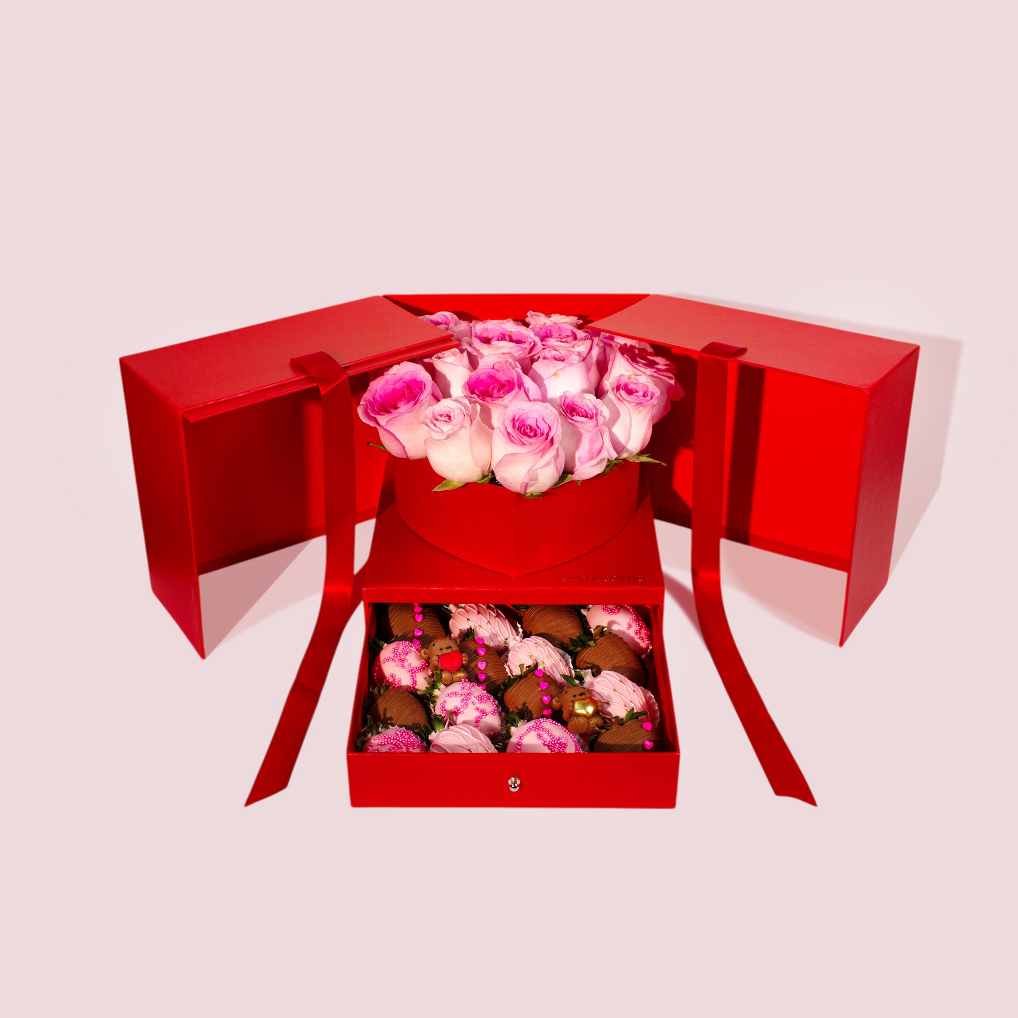 Treat your special someone to an unforgettable Valentine's Day experience with this beautifully packaged premium surprise box. Inside, you'll discover luscious, chocolate-covered strawberries—each one meticulously dipped in silky smooth chocolate and finished to perfection. Paired with these irresistible treats are fresh, vibrant roses, handpicked for their elegance and charm. This thoughtful combination of delicious chocolates and stunning flowers makes for the ultimate Valentine's Day gift, offering a perfect balance of sweetness and romance. The exquisite presentation ensures a memorable and heartfelt surprise for your loved one, making this gift the ideal way to show how much you care.