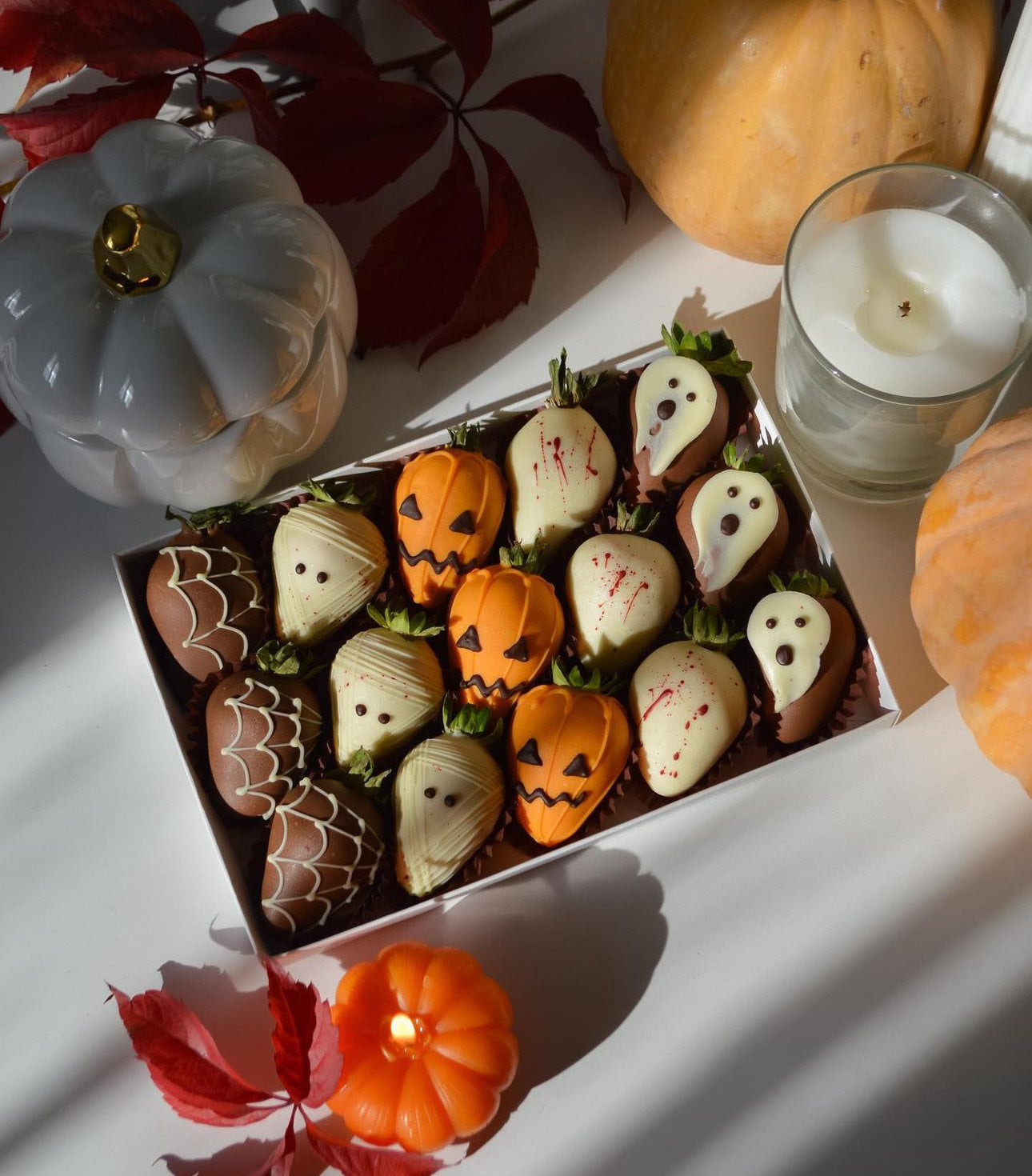 Elevate your celebration with our "Spooky" Box of chocolate-covered strawberries! These spooky-themed treats feature fresh and juicy strawberries hand-dipped in Belgian chocolate, with a Halloween twist. Experience a unique and delicious adventure this Halloween with our mummy, ghost-designed and spooky strawberries.